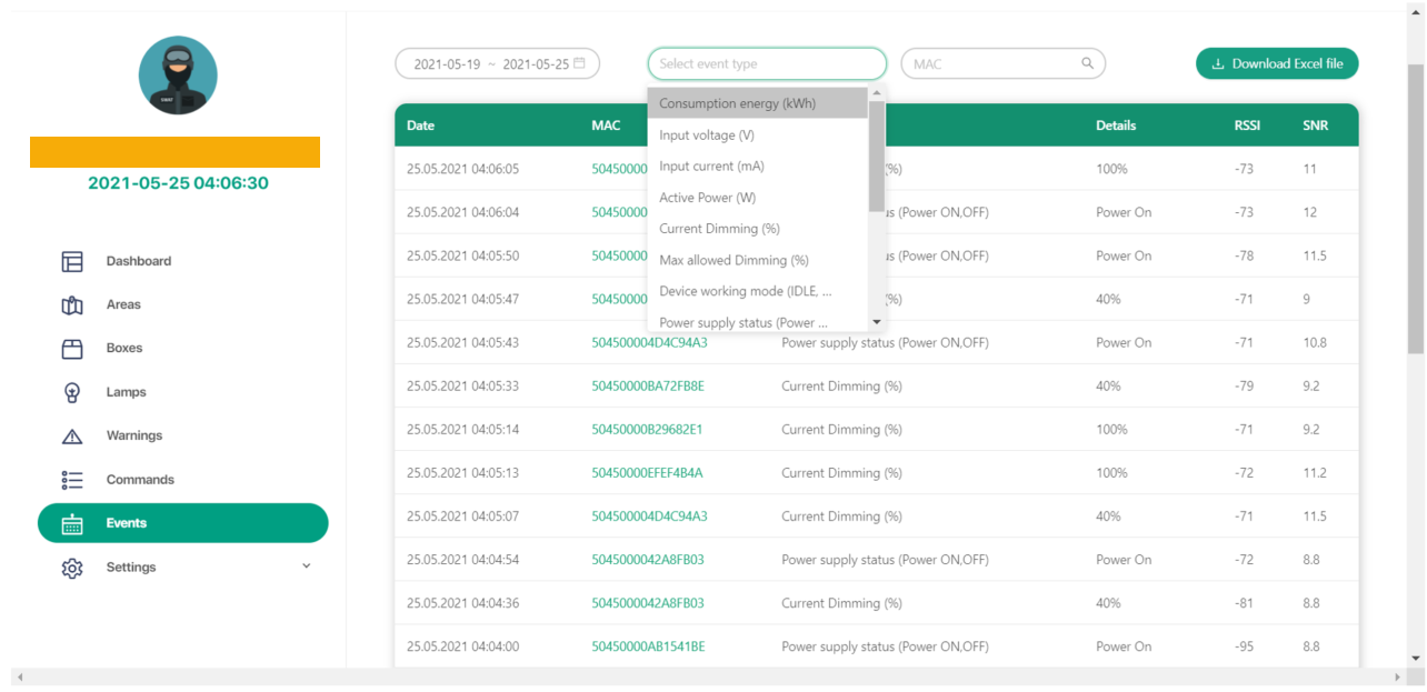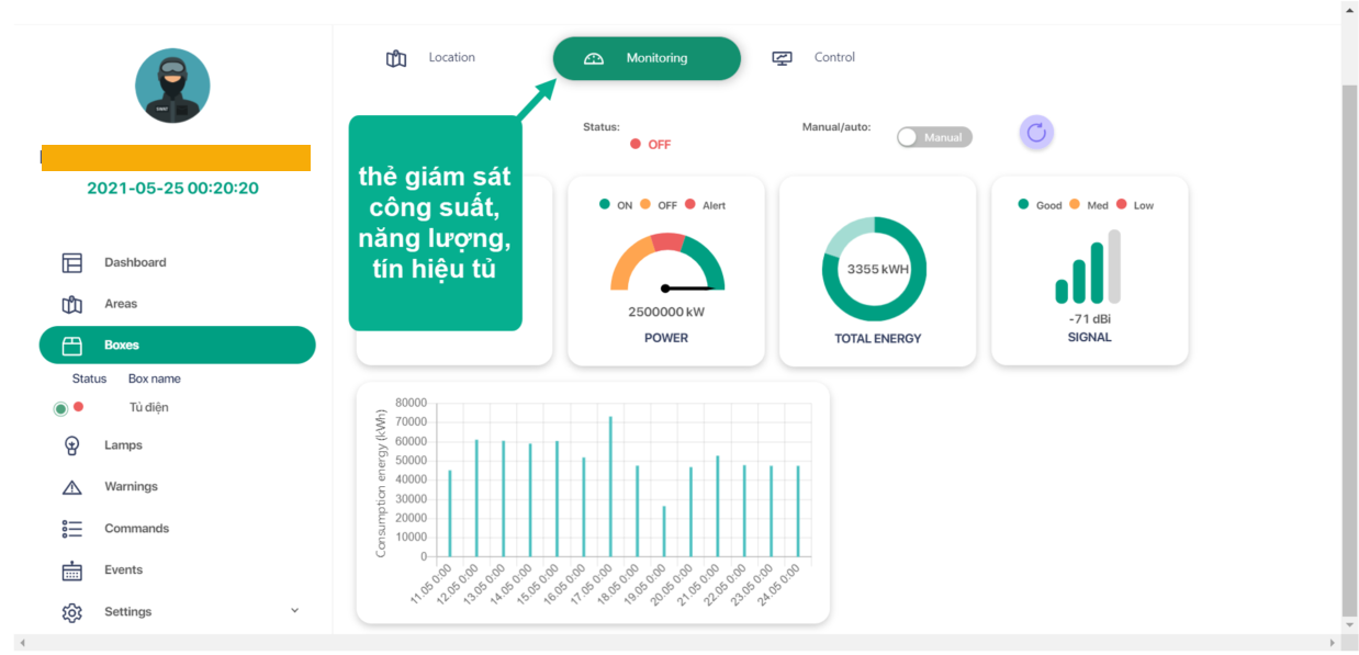 Chọn tab monitoring để xem công suất tức thời, trạng thái dimming, dòng điện, điện áp theo thời gian, năng lượng tổng tiêu thụ và năng lượng tiêu thụ hàng ngày