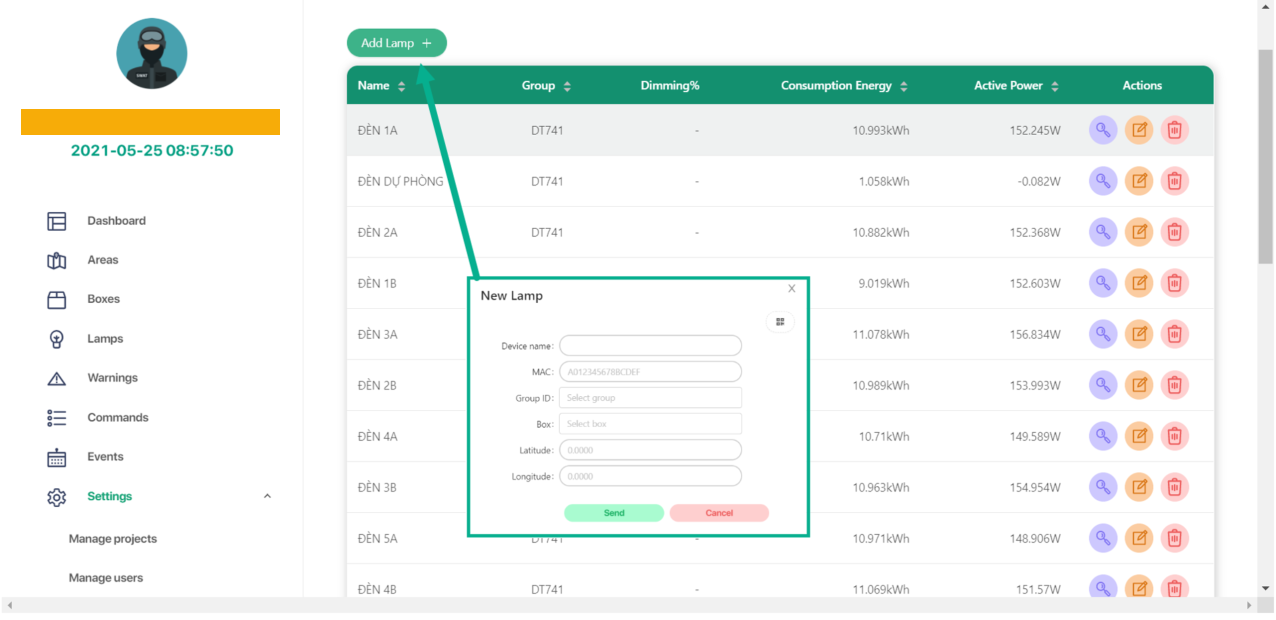 - Thống kê: theo dự án, khu vực, tủ điện và các đèn với các thông tin như vị trí, trạng thái hoạt động, giám sát các thông số, cài đặt điều khiển. Các kịch bản chiếu sáng linh hoạt thông minh, tiết kiệm và hiệu năng được cài đặt thay đổi từ xa một cánh nhanh chóng và hàng loạt