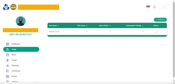 Thống kê, tạo mới khu vực, khi click vào khu vực, hệ thống sẽ chuyển đến trang chứa các tủ điện thuộc khu vực