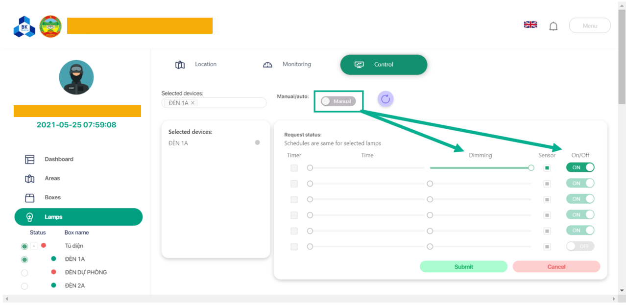 Khi cần điều khiển trực tiếp, chuyển chế độ điều khiển sang manual cài đặt trạng thái (ON/OFF/DIMMING) và gởi lệnh để đèn tác động trực tiếp